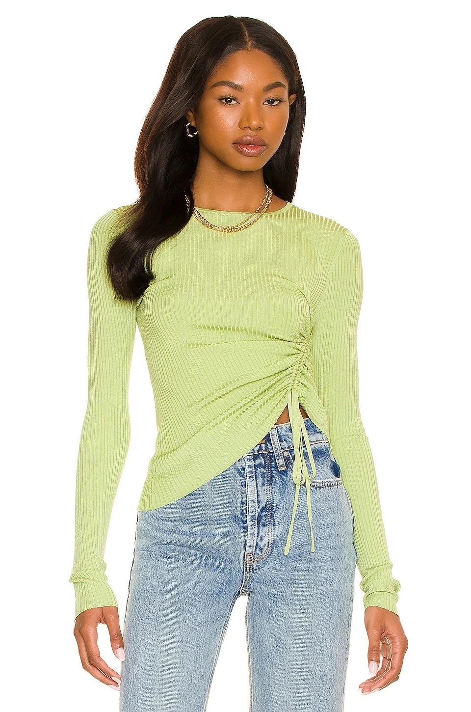 - Ruched drawstring side with asymmetric hem